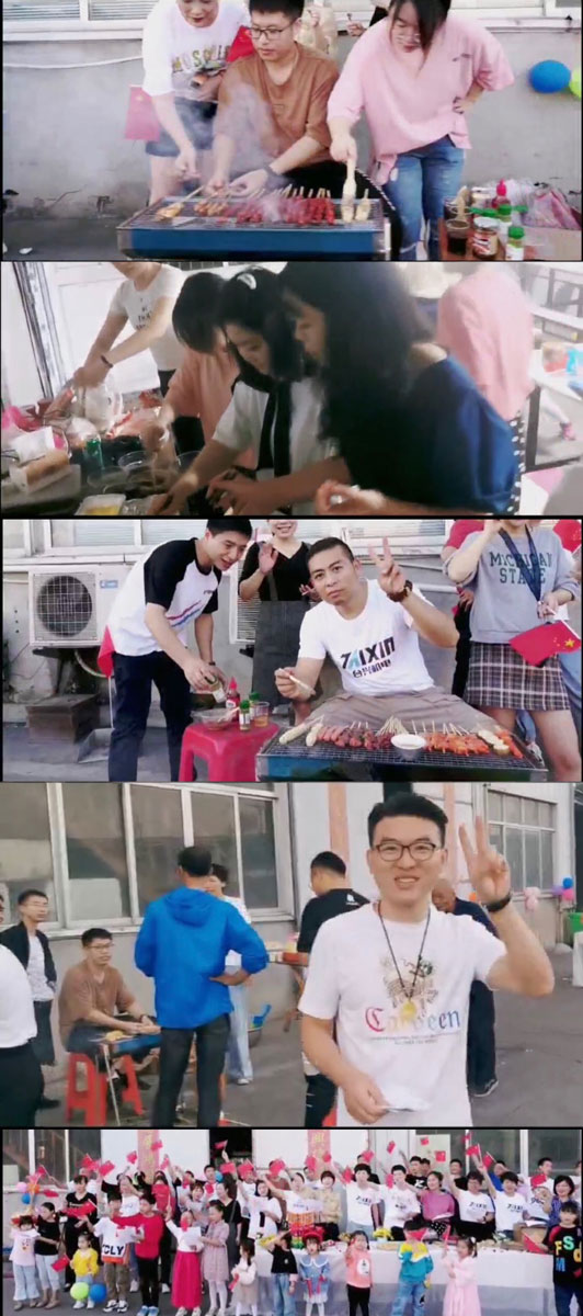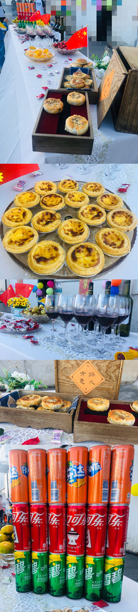 歌曲唱完之后,燒烤區(qū)也烤出了幾大盆碩果:小黃魚、秋刀魚、生蠔、對蝦、臘腸、羊肉串、骨肉相連、香菇、金針菇、小白菜、玉米、年糕、韭菜、茄子、土豆、饅頭、面筋等,大伙們都禮貌、謙虛地拿著各自喜歡的美食,品嘗起來,心里樂開了花。夜幕慢慢降臨,食堂里的主廚們也出爐了各自的拿手好菜,分發(fā)到每一桌。有江浙菜、有湘菜、有川菜,還有粵菜。滿滿的一桌菜,滿滿的一桌人,家人們在觥籌交錯之間,在舉國歡慶之時,一起暢談甜蜜的過去,幸福的當(dāng)下,以及美好的明天?;顒映掷m(xù)到晚上8點(diǎn),眾人才在依依不舍中互道離別。