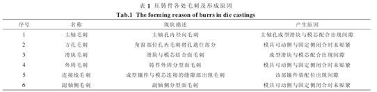 分析的鋁壓鑄件三維實體如圖1。其上面要安裝鏡片、軸承、線圈等,一共近50個精密零件,X、Y、Z 3個軸向主、副軸及孔等的位置公差最小在0.005 mm,各鏡片安裝角度偏差在0.5°以下,屬于精密壓鑄件,毛刺的控制也就非常嚴(yán)格。我們通過對該產(chǎn)品在近幾年工程不良信息統(tǒng)計分析,發(fā)現(xiàn)在影響其質(zhì)量的因素中,毛刺是主要因素之一。 該產(chǎn)品產(chǎn)生毛刺的部位如圖2。其中1-主軸毛刺;2-方孔毛刺;3-滑塊毛刺;4-周邊毛刺;5-連接線毛刺;6-副軸側(cè)毛刺;7-頂針毛刺。 下面我們對以上部位的毛刺及成因進行具體分析,如表1。