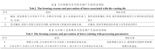 在生產(chǎn)過程中,毛刺產(chǎn)生的因素是多方面的,主要有壓鑄機性能的穩(wěn)定性、壓鑄工藝參數(shù)的選用、合金成分及熔煉工藝、脫模劑的使用、模具結(jié)構(gòu)的合理和制造質(zhì)量。從工程實際來說,壓鑄機的性能、模具結(jié)構(gòu)都是很少改變的,因此,如何調(diào)整壓鑄工藝參數(shù)及對模具的一些簡單修理,從而提高產(chǎn)品質(zhì)量顯得特別重要。本文結(jié)合實際經(jīng)驗,總結(jié)了壓鑄模具和工藝參數(shù)可能產(chǎn)生毛刺的原因及預(yù)防對策,如表2、表3。
