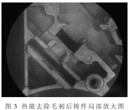 用以前的方法, 去毛刺質(zhì)量難以保證, 效果不穩(wěn)定,組裝后殘余毛刺因流體作用脫落剝離,以致可能影響產(chǎn)品的性能,而熱能去毛刺法對此類產(chǎn)品有較好的效果。本文鑄件用熱能毛刺機去除毛刺后的局部放大如圖3所示,可以看出,該鑄件毛刺基本都去除了,沒有殘留,而且沒有引起制品的二次損,尤其是在形狀復(fù)雜的細小部位。